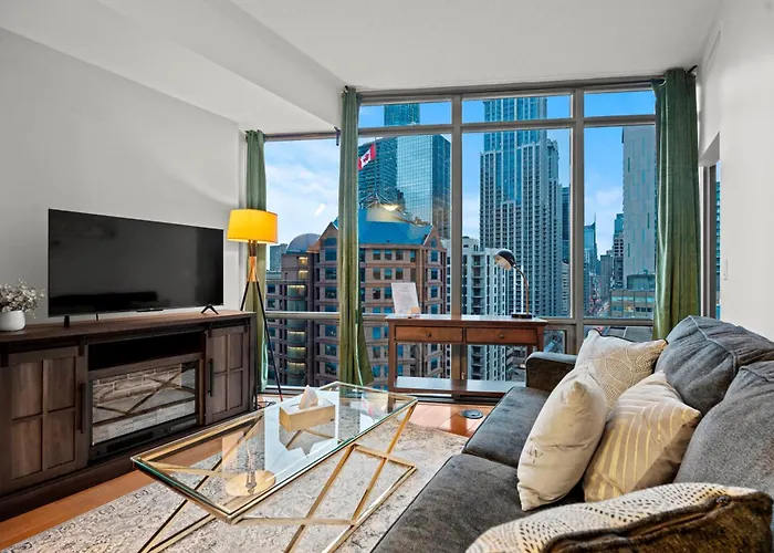 The spacious 1Br High Floor View Downtown Toronto Apartment is located 1.2 km from the urban plaza "Nathan Phillips Square" and a 25-minute walk from Ripley's Aquarium of Canada.